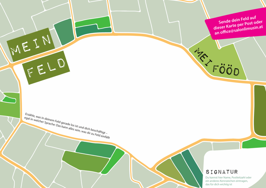 Erzähle, was in deinem Feld – deim Fööd gerade los ist und dich beschäftigt – egal in welcher Sprache: Das kann alles sein, was dir zu „Feld“ einfällt. Sende uns dein Feld per Mail an: office@salonlimusin.at oder hole dir eine Postkarte in der Kulturinitiative deines Vertrauens.